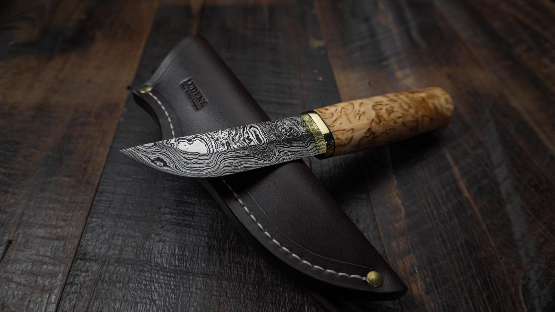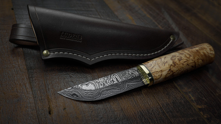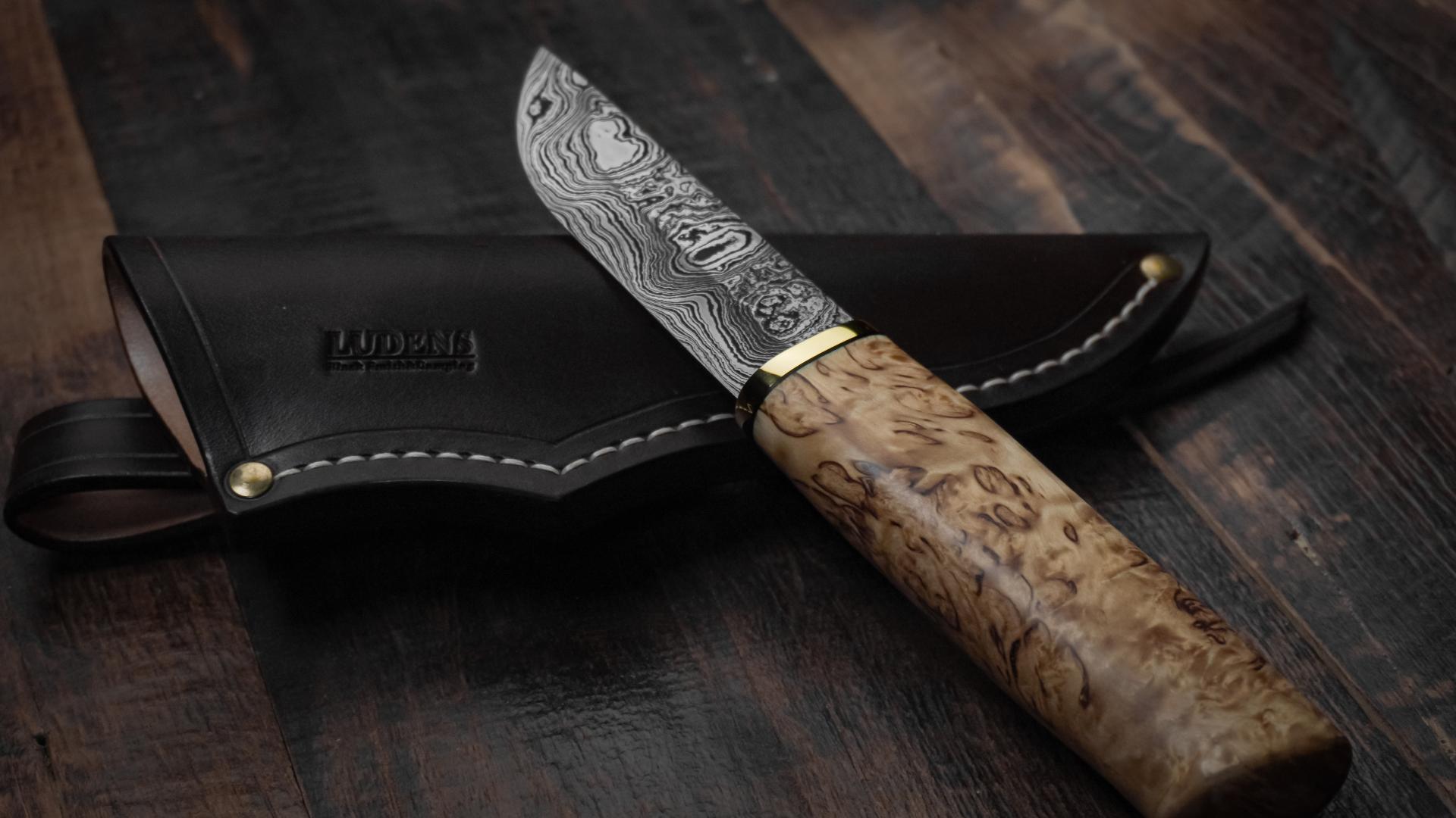 Ludens Puukko Damascus Knife의 블레이드는 1095 & 15n20의 두가지 강철유형으로 패턴 용접되어 단조 됩니다.