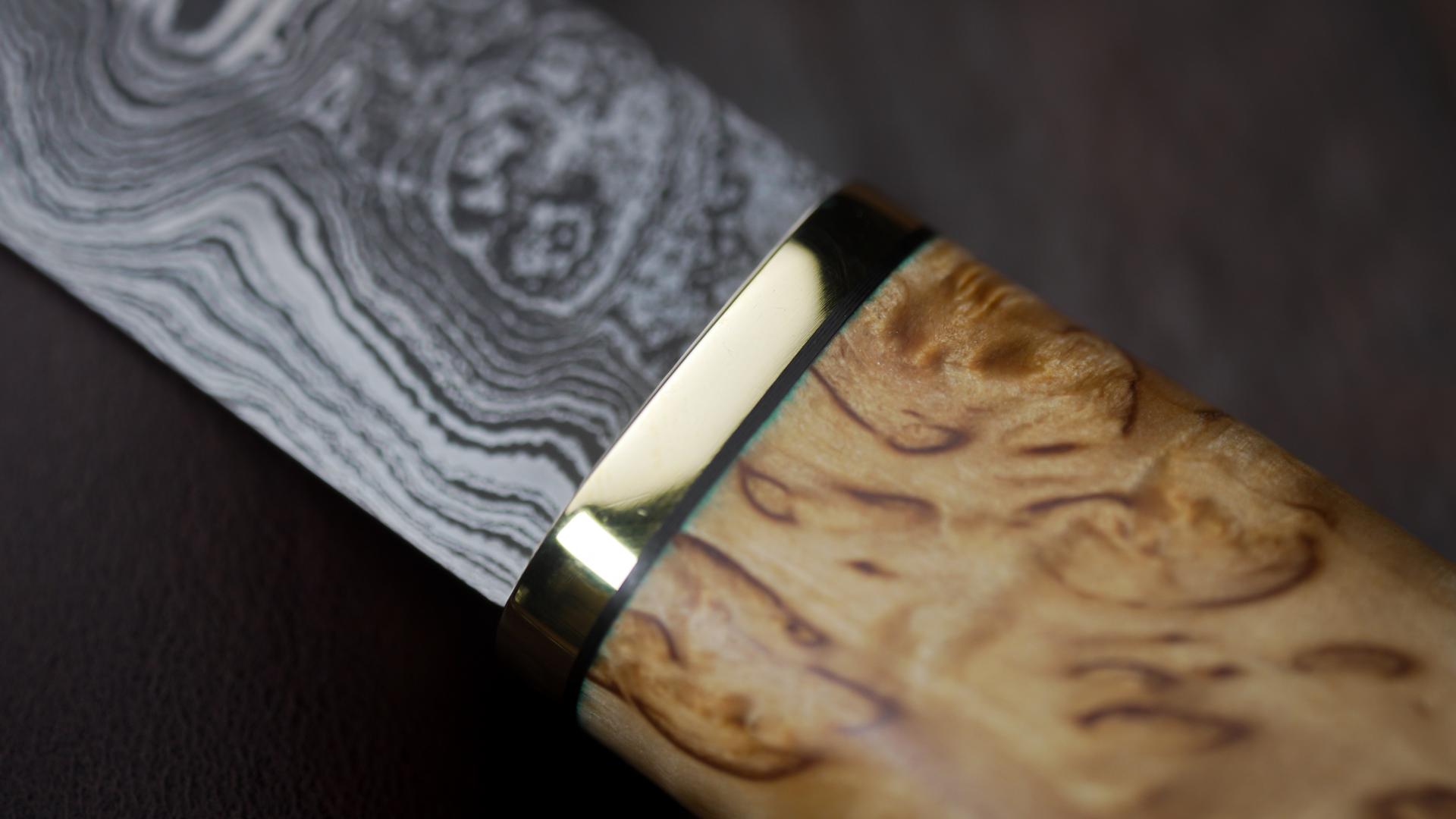 이 나이프의 손잡이는 안정화된 Lapland Curly birch 블록으로 만들어지며, Pure Tung Oil로 마감됩니다.
